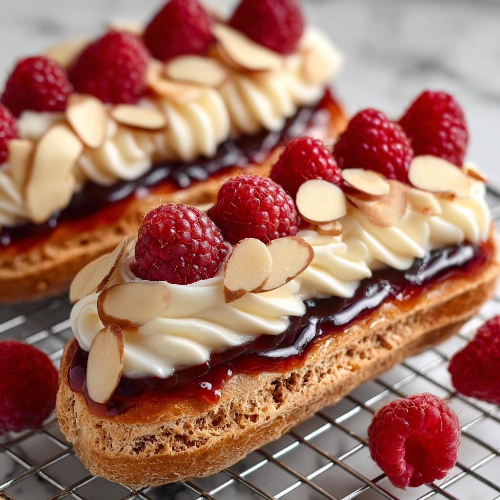 Almond Raspberry Éclair Towers are a delightful French-inspired dessert featuring light and airy choux pastry filled with a luscious almond-flavored cream and raspberry jam. Topped with toasted almonds and a glossy apricot glaze, these elegant towers combine crisp textures and rich flavors, perfect for special occasions or a sophisticated treat.
