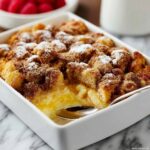 This classic baked French toast casserole is a perfect make-ahead breakfast or brunch dish. Cubed sourdough bread is soaked overnight in a rich custard of eggs, milk, cream, and sugars, then topped with a buttery cinnamon streusel and baked until golden and crispy on top while remaining soft inside. Serve warm with butter, syrup, and fresh blueberries for a comforting and crowd-pleasing morning treat.
