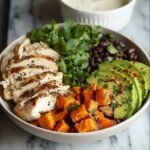 A wholesome and flavorful Chicken and Sweet Potato Bowl featuring roasted sweet potatoes, seasoned grilled chicken, nutrient-rich quinoa or brown rice, black beans, creamy avocado, and a zesty Greek yogurt lime drizzle. Perfect for a balanced and satisfying meal ready in under 40 minutes.