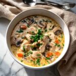 This easy slow cooker chicken and mushroom soup is a comforting and hearty meal perfect for any day. Tender chunks of chicken breast are slow-cooked with fresh vegetables, basmati rice, and fragrant herbs, then enriched with creamy single cream and sautéed chestnut mushrooms for a deliciously rich finish. It’s simple to prepare, requiring minimal hands-on time, making it an ideal recipe for busy households seeking a wholesome, homemade soup.