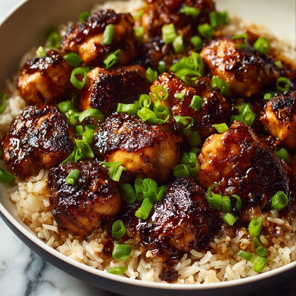 Honey BBQ Chicken Rice is a flavorful and easy-to-make dish featuring juicy, spice-rubbed chicken thighs simmered in a homemade honey BBQ sauce, served over tender long-grain rice and garnished with green onions, sesame seeds, and red pepper flakes for a delightful meal that’s perfect for family dinners.