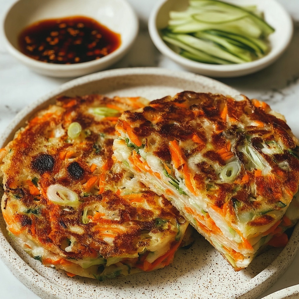 Traditionally, Korean vegetable pancakes pair perfectly with a soy-based dipping sauce, offering a tangy, slightly salty contrast. You can also serve them alongside pickled vegetables or a crisp green salad to add brightness and balance the richness.