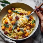 A comforting and flavorful roasted butternut squash and sage pasta dish that combines tender, caramelized squash with aromatic sage and creamy Parmesan cheese for a perfect fall meal.