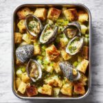 Gently fold the chopped oysters into the bread mixture. Take care not to overmix, so the oysters stay nicely distributed and retain their delicate texture, which makes the dish so special.
