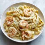 This Shrimp Alfredo recipe is a creamy and indulgent pasta dish featuring tender shrimp cooked in a garlic butter sauce, combined with a rich Alfredo cream sauce made with Parmesan cheese. Ready in 30 minutes, it makes a perfect comforting meal for four, blending classic Italian flavors with a quick stovetop cooking method.