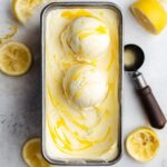 Transfer the churned ice cream to a loaf pan or any sealable container. Pipe the reserved lemon curd over the top for a gorgeous, tangy layer. Cover with parchment paper, then pop it in the freezer for 3 to 4 hours until solid. If you prefer a soft serve texture, you can enjoy it straight from the machine right away!